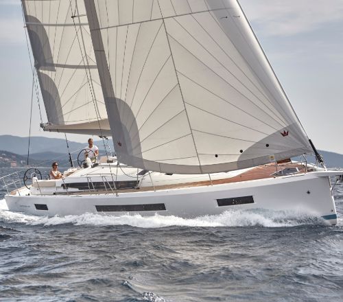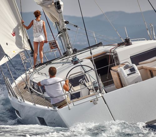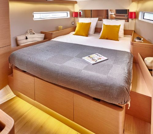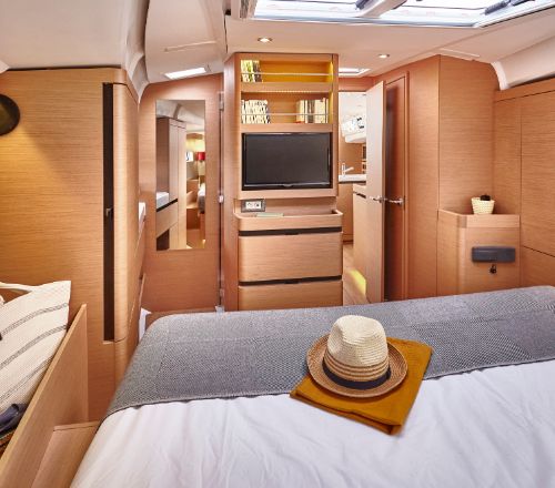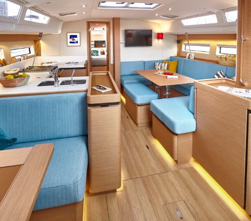This sailboat from 49 feet has revolutionized cruising: she is the only sailboat in their category to feature movement about the deck without obstacle. For example, the side decks are inclined, sloping down to the cockpit floor, meaning that there is no need to step over the coaming!